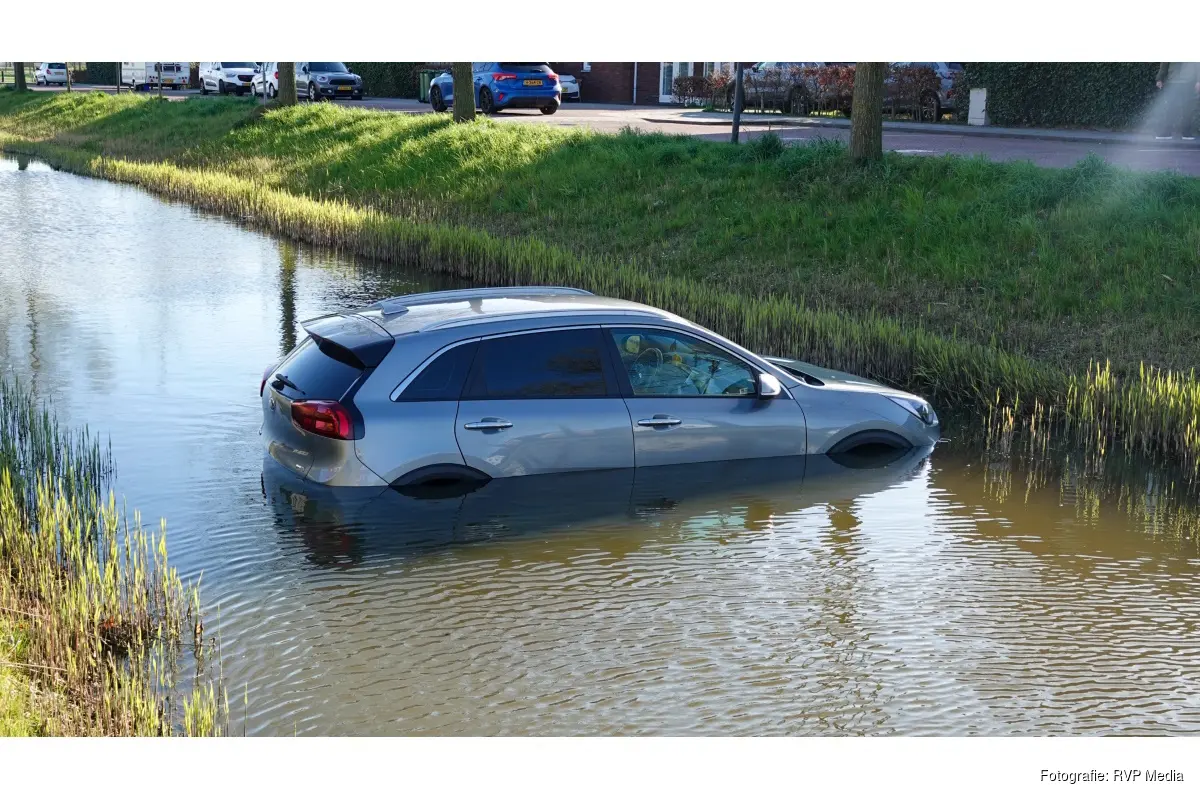 De politie heeft ter plaatse gegevens genoteerd. Een bergingsbedrijf komt om het voertuig uit het water te gaan takelen.