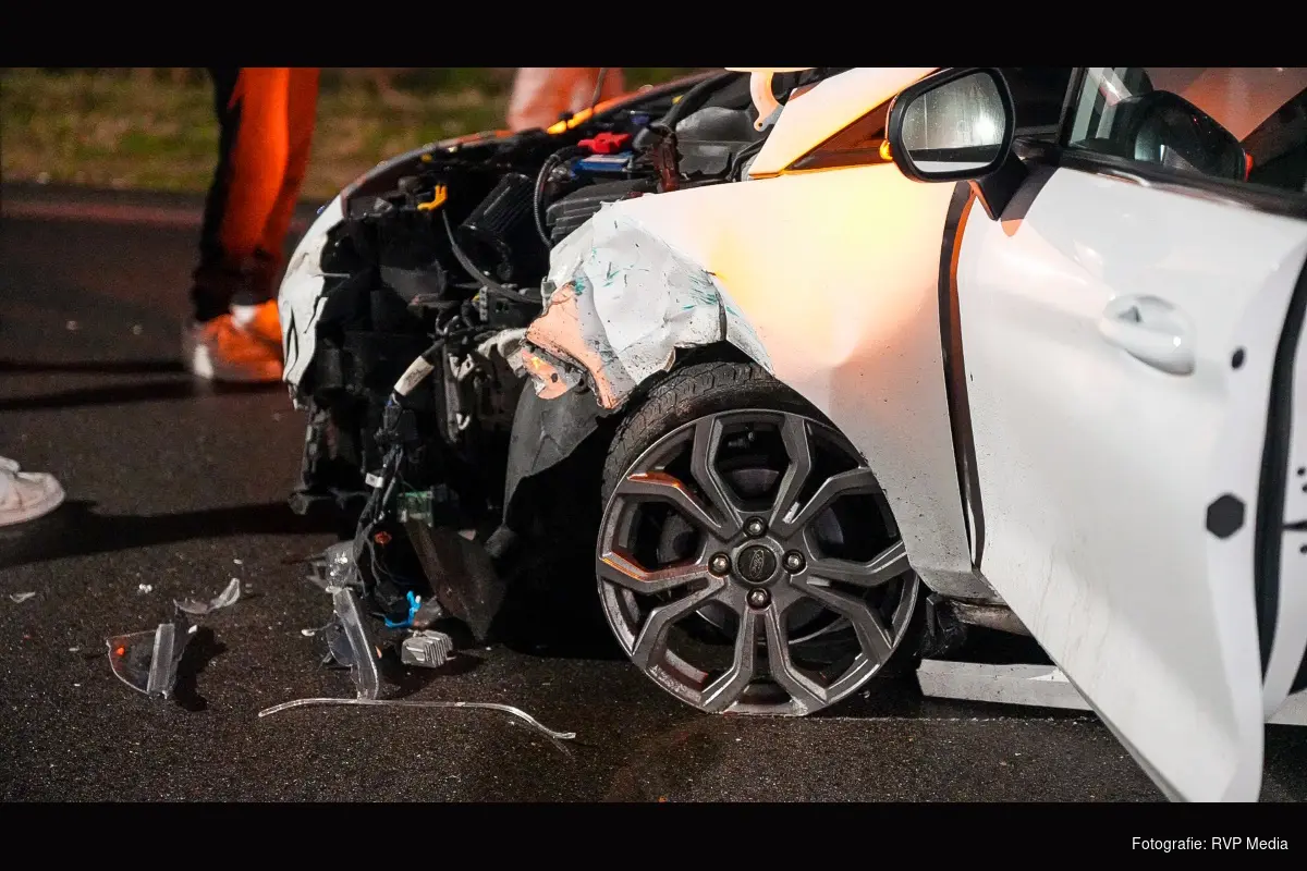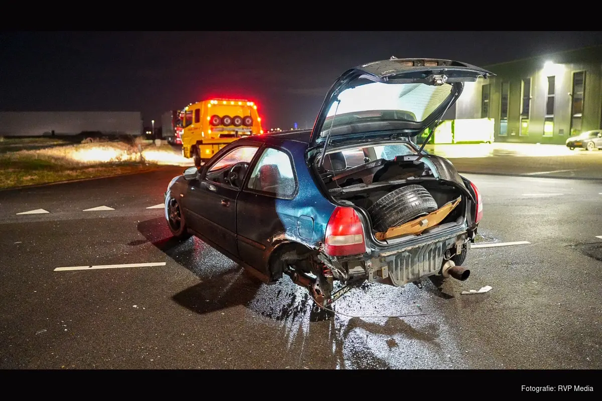 De donkere auto tolde door de aanrijding om zijn as heen en kwam vervolgens zonder achterwiel tot stilstand op de weg.