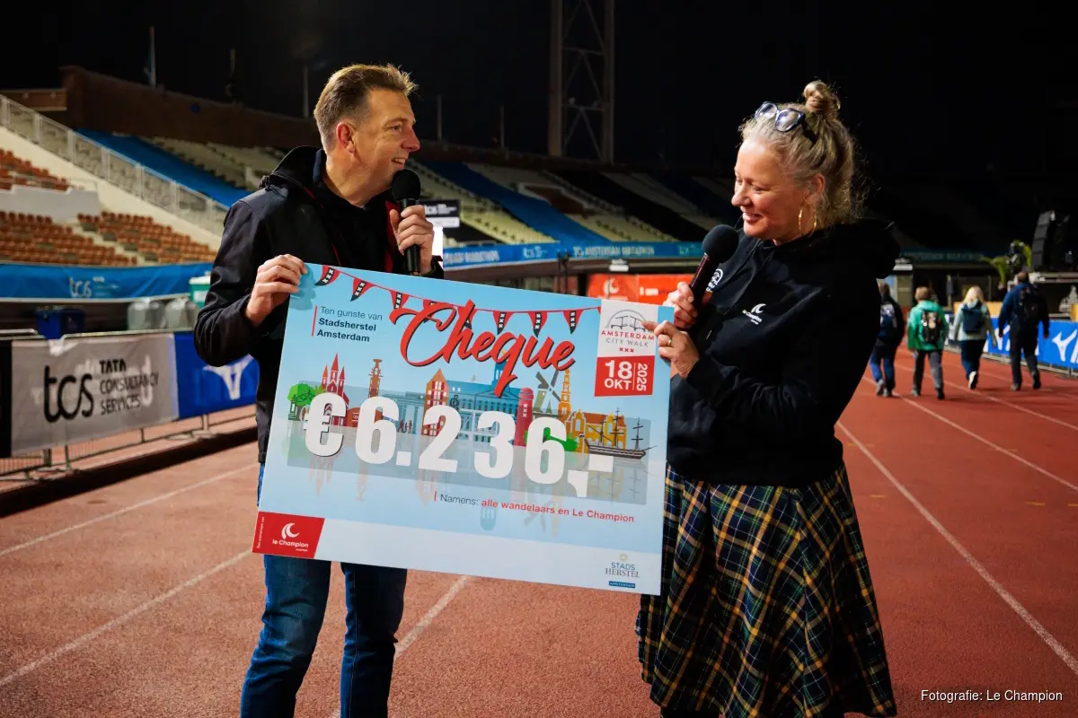 AMSTERDAM - Ruim een uur voor zonsopkomst stroomde de atletiekbaan van het Olympisch Stadion vanmorgen vol met de eerste groep wandelaars. Verspreid over drie startlocaties startten vanmorgen 14.400 wandelaars uit 19 landen aan een van de zes afstanden van de Amsterdam City Walk. Het zachte herfstweer, met zon en weinig wind, maakte het wandelfeest in de hoofdstad compleet en zorgde voor een sfeervol en gezellig druk finishfeest bij Strandzuid. Voor Stadsherstel Amsterdam, ook dit jaar weer het goede doel van het evenement, werd het mooie bedrag van € 6.236,- ingezameld.